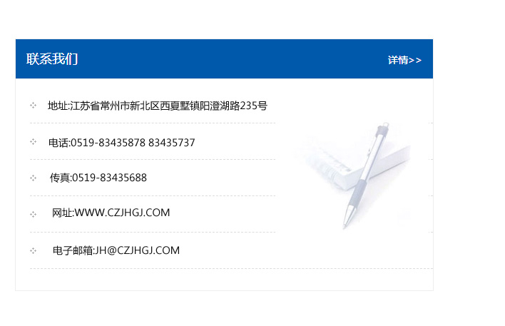 地址:常州市新北區友邦商務大廈1幢16、17層  電話:0519-85101652  傳真:0519-85112595  郵編:213022  網址:www.cz-jiayue_cn.hbdwqc.com  郵箱:xiajifengaa@163.com